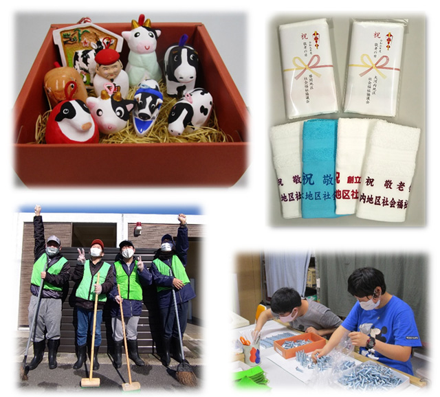 - 受託製品 記念タオルの製作、チラシ折り、建設資材の組み立て